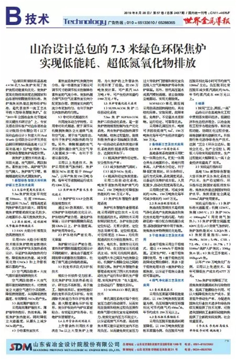 “SDM大型綠色智能焦爐技術”是山冶設計與意大利PW公司合作的代表世界一流工藝水平的大型焦爐技術。由山冶設計進行整體規劃及設計,采用了分段加熱、非對稱式煙道、薄爐墻、單孔調壓、火焰分析模型等技術,具有技術成熟先進、結構嚴密合理、單孔容量大、占地面積小、熱工效率高、自動化水平高、環保指標先進等諸多優點。在焦爐爐體、焦爐機械、工藝裝備、自動化和環保水平等方面代表國際先進水平。同時,在世界上首次運用焦爐爐內脫硝工藝,氮氧化物排放指標符合國家最嚴環保排放標準。