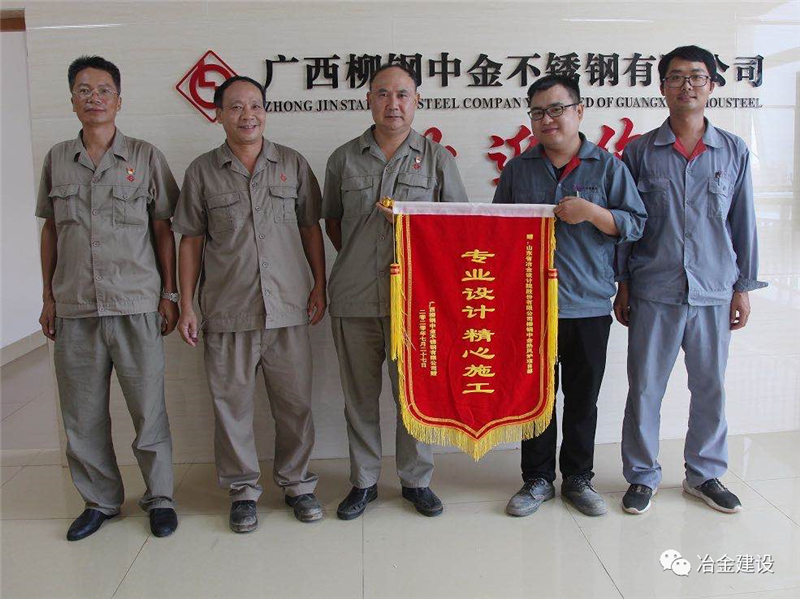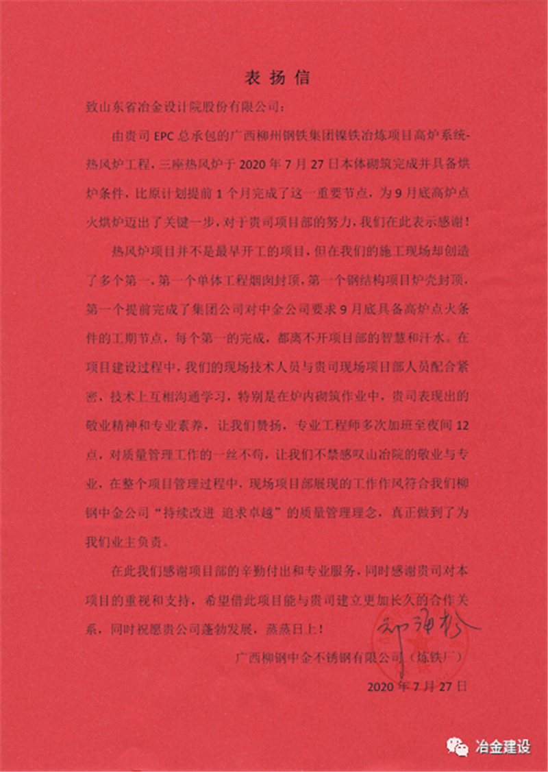 就是憑著這股韌勁和山冶設計“敢打硬仗、一切為用戶著想”的精神,柳鋼中金熱風爐工程的各項工作推進順利,并多次在安全、質量、進度大例會上受到表揚。在27日砌筑封頂之后,上午柳鋼中金煉鐵廠送來表揚信,對現場項目部的工作給予了肯定,下午柳鋼中金公司副總經理張洪波授予了現場項目部“專業設計精心施工”的錦旗,盛贊山冶設計專業、敬業!