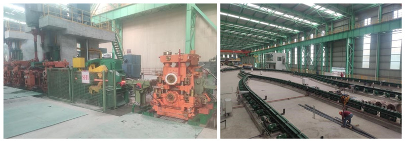 龍騰特鋼高速端板法蘭生產(chǎn)線是國(guó)內(nèi)采用全連軋工藝生產(chǎn)的高速端板法蘭軋鋼生產(chǎn)線,產(chǎn)品涵蓋國(guó)內(nèi)外端板法蘭的絕大部分規(guī)格要求。通過(guò)雙蓄熱步進(jìn)式加熱爐加熱后,鋼坯進(jìn)入11臺(tái)平立交替布置的高剛度短應(yīng)力線軋機(jī),實(shí)現(xiàn)全連續(xù)無(wú)扭軋制。通過(guò)我院專利設(shè)備浮動(dòng)式夾送輥和平立轉(zhuǎn)換裝置,不同規(guī)格的端板法蘭扁鋼可在軋制完成后實(shí)現(xiàn)快速平轉(zhuǎn)立,并通過(guò)轉(zhuǎn)轍器及卷前輥道分別輸送至6臺(tái)卷取機(jī)進(jìn)行卷取。生產(chǎn)線配備先進(jìn)的自動(dòng)控制系統(tǒng),對(duì)全線物流進(jìn)行跟蹤,實(shí)現(xiàn)工藝過(guò)程的自動(dòng)化。先進(jìn)的設(shè)備與合理的工藝流程,大大提高了生產(chǎn)線的生產(chǎn)效率和成材率,預(yù)計(jì)年產(chǎn)量可達(dá)50萬(wàn)噸。