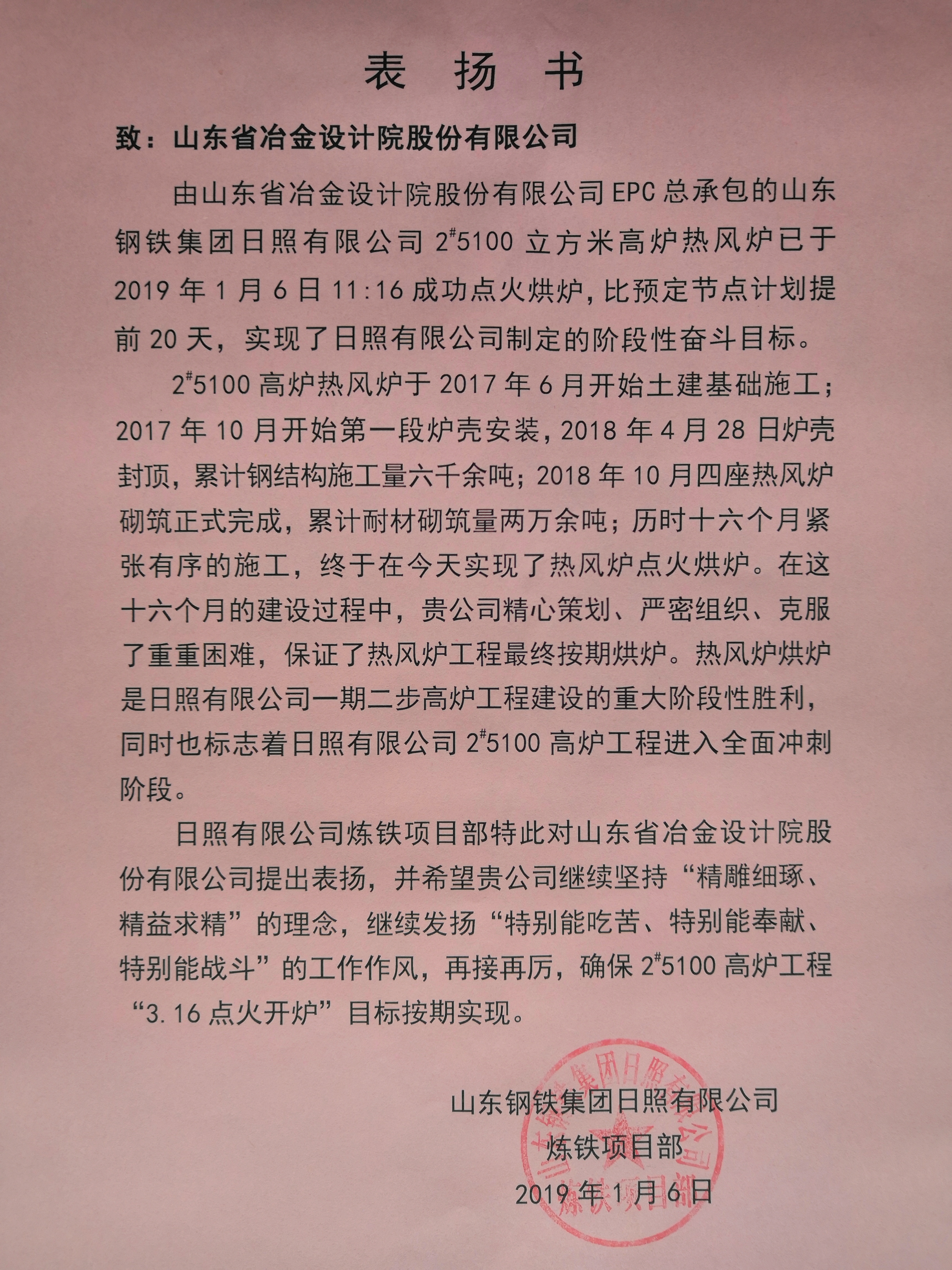 2019年1月6日11時(shí)16分,隨著山鋼集團(tuán)日照公司副總經(jīng)理王子金:“我宣布山東鋼鐵集團(tuán)日照精品基地2#5100立方米高爐熱風(fēng)爐點(diǎn)火烘爐開始”的號(hào)令, 由我公司總包的山鋼集團(tuán)日照精品基地2#5100立方米高爐熱風(fēng)爐正式點(diǎn)火烘爐。這標(biāo)志由公司總承包2#5100立方米高爐工程熱風(fēng)爐烘爐的重大節(jié)點(diǎn)比計(jì)劃提前20天實(shí)現(xiàn)階段性?shī)^斗目標(biāo)。公司副總經(jīng)理劉洪亮參加烘爐儀式并發(fā)表了講話。當(dāng)天,山東鋼鐵集團(tuán)日照有限公司向公司發(fā)來了表?yè)P(yáng)書,贊揚(yáng)山冶人堅(jiān)持“精雕細(xì)琢、精益求精”的理念,希望再接再厲確保后續(xù)工作目標(biāo)如期實(shí)現(xiàn)。