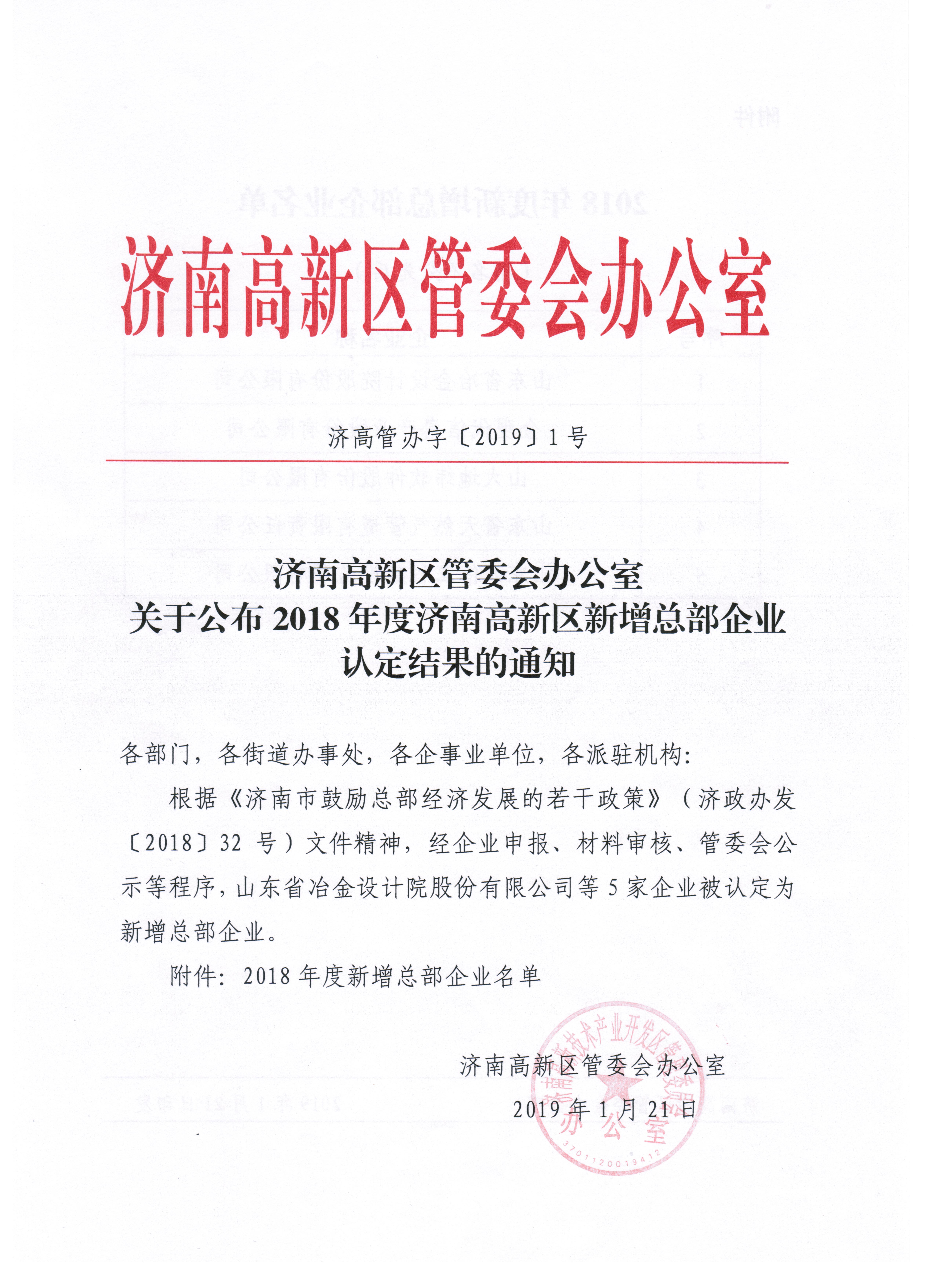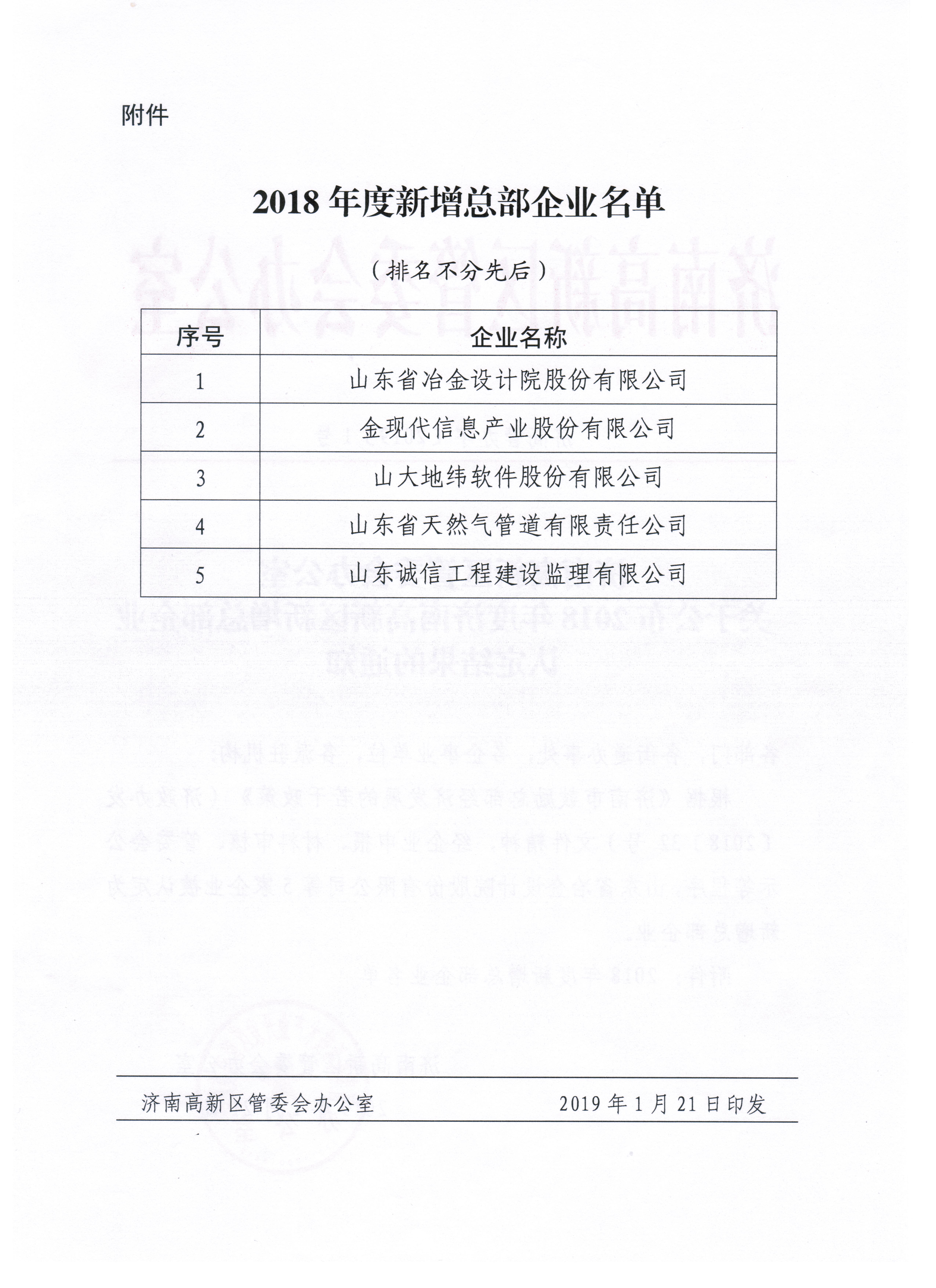 近日,山東省冶金設計院股份有限公司被濟南市認定為首批“總部企業”。這標志著我公司的綜合實力以及對地方發展的貢獻得到了濟南市政府的高度認可。